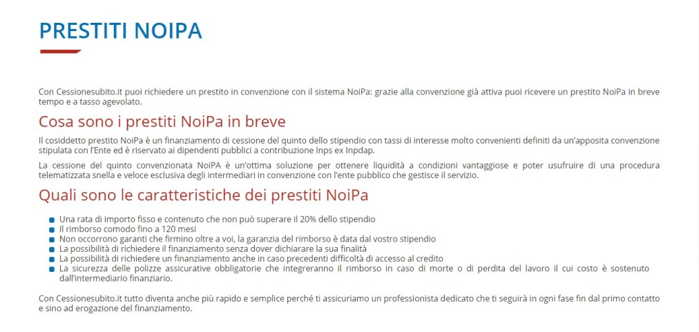 I vantaggi di Cessionesubito.it? Anzitutto, la possibilità di richiedere un preventivo gratuito e senza alcun impegno, l’assistenza gratuita e la totale trasparenza di ogni servizio: prestiti INPS e prestiti INPDAP non avranno più segreti! Abbiamo progettato e realizzato il sito di Cessionesubito.it con l’obiettivo di aiutare il committente non solo a promuovere la sua attività online ma a farlo anche in modo chiaro e professionale, spiegando ogni tipologia di prodotto finanziario, i vantaggi e le condizioni in modo semplice e assolutamente comprensibile anche ai meno preparati in materia. Cessionesubito.it è un sito moderno e di immediata consultazione. E’ facile navigarvi all’interno e scoprire di più su pacchetti e servizi finanziari.
