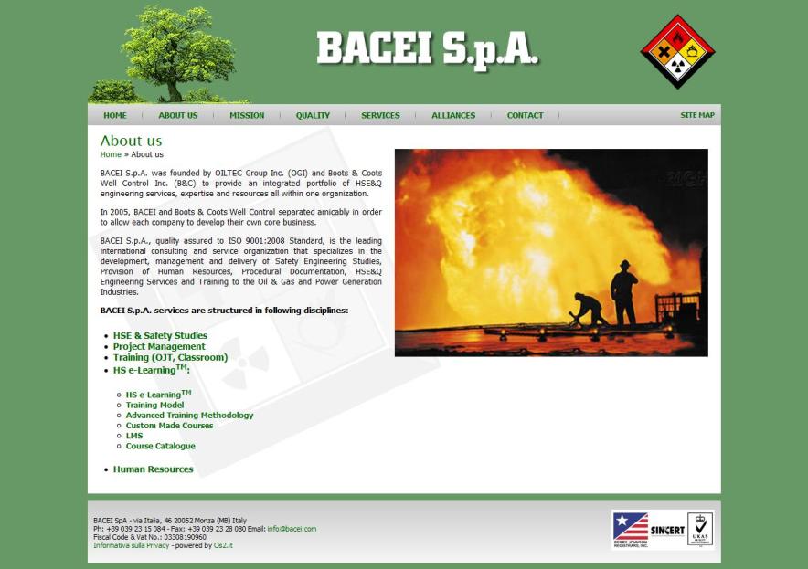 Obiettivi: Bacei S.p.A opera ovunque nel mondo ed è esperta nel Safety Engineering, Prevenzione del Rischio, tutela ambientale, e-learning e nella Ricerca e Fornitura di Specialisti nei settori petrolifero, energetico e nucleare.