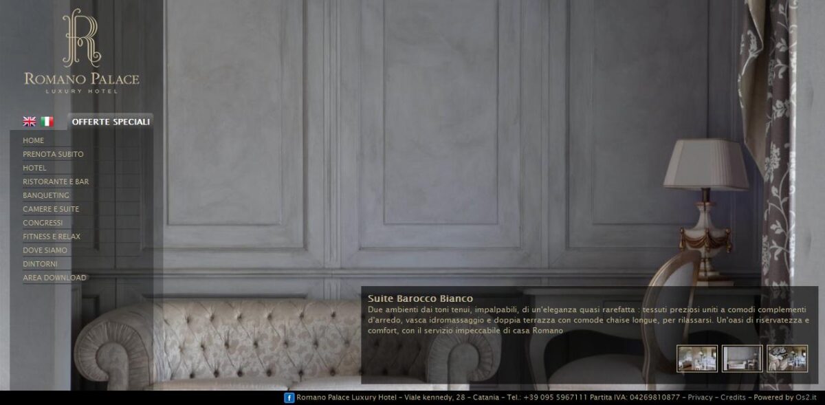 OBIETTIVI: Romano Palace è uno dei due Hotel cui fa capo Romano Collection, un prestigioso brand di proprietà della famiglia Romano che gestisce due Hotel di lusso a Catania. Si tratta di una esclusiva location 5 stelle ideale per viaggi di piacere e di lavoro, ma anche per ricevimenti e gala: per i matrimoni Catania offre molte possibilità, ma Romano Palace garantisce senza dubbio l’alta qualità dei servizi unita ad una splendida scenografia di lusso. Per questo cliente Os2 ha già effettuato una dettagliata analisi di web marketing mettendo in evidenza diversi problemi proprio all’interno del sito in questione. L’obiettivo è stato quello di migliorare tecnicamente e qualitativamente il già esistente romanopalace.it in modo da rendere più efficace anche la strategia di posizionamento richiesta dal cliente.